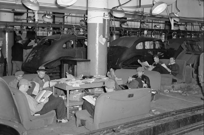 Sit-down strikers in the Fisher body plant factory number three. Flint, Michigan, 1937: Wikimedia Commons