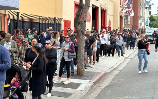 Ridiculously long line of Mexican citizens lining up to vote in the Mexican presidential election in July, 2024 outside the San Diego consulate. Photo: Martin Eder